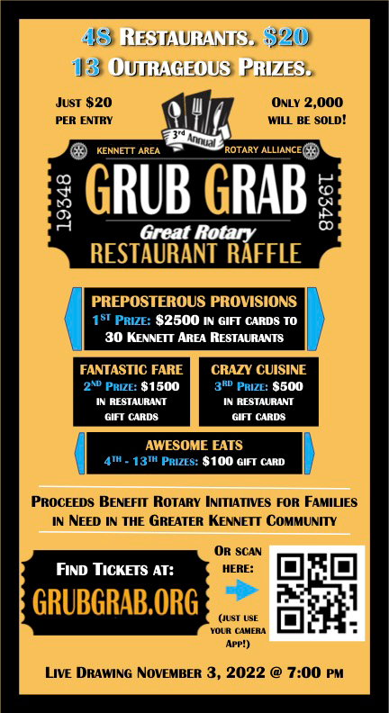 Grub Grab Great Rotary Restaurant Raffle is a major fundraiser for the Kennett Area Rotary Alliance. In 2021, the Grub Grab Great Rotary Restaurant Raffle raised over $44,000 in support of Rotary initiatives in the Kennett Square community and around the world. The raffle drawing will be held on Thursday, November 3 at 7 p.m. at the Market at Liberty Place in Kennett Square and will be streamed live on Facebook. All winners will be notified the night of the drawing. A list of the participating restaurants can be found at http://grubgrab.org.
