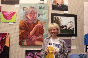 Emma Bryan, first-place category winner from Bayard Rustin High School, smiles with her still life portrait.