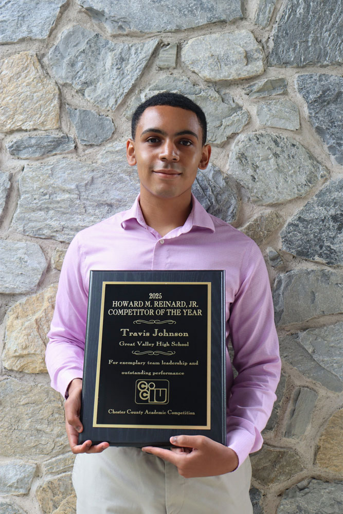 The honor of Competitor of the Year is awarded to a Chester County Academic Competition participant who has demonstrated exemplary team leadership and outstanding performance. This year’s Howard M. Reinard Jr. Competitor of the Year award was presented to Travis Johnson of Great Valley High School, who was also selected as the team’s MVP.