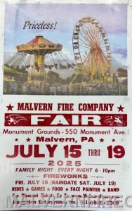 From July 15-19, the Malvern Fire Company Fair (Monument Grounds, Monument Avenue, Malvern, 610-647-0693, http://www.pa-carnivals.com) will be held from 6-10 p.m. each night.The free Malvern Fire Company Fair features rides, games and fun for the entire family and discount ride coupons will be available at local merchants.