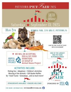 The event, which runs from 10 a.m.-2 p.m., will feature a gathering of animal rescues, pet-care businesses and animal wellness organizations for a day of fun and community fellowship in Pottstown’s Memorial Park.