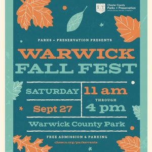 Warwick Fall Festival (Warwick County Park, 191 County Park Road, Pottstown, www.chesco.org/2478/Warwick-Fall-Festival) will be held on September 27 from 11 a.m.-4 p.m.