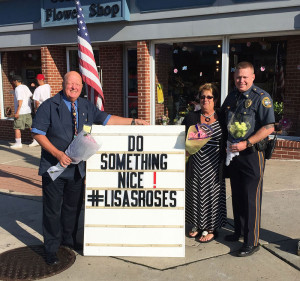 The DePedros with City Police Lt. James Audette, outside of the Coatesville Flower Shop for Lisa’s Roses.